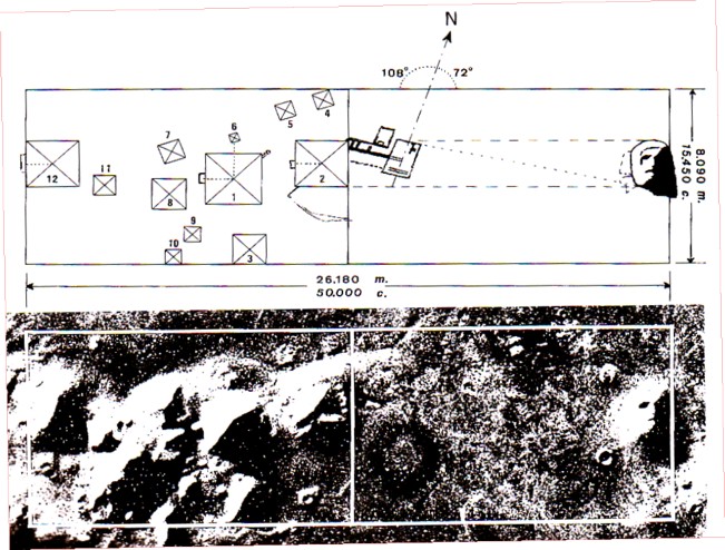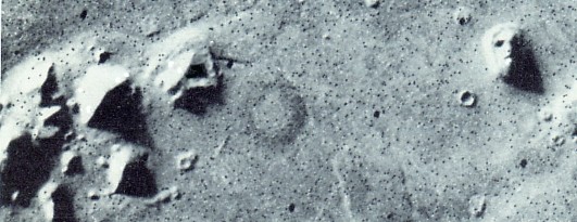 Si nous n'allons pas du tout épiloguer ici, sur le visage qui apparaît à droite de l'image et qui a fait l'objet de discussions sans fin, pour être finalement classé par les astronomes orthodoxes, comme un caprice de la nature ayant façonné par hasard une montagne en forme de tête humaine, il faudrait, à notre avis, vraiment avoir un esprit retors pour faire semblant de ne pas voir le caractère artificiel de cette "forteresse", dont on aperçoit (vers la gauche de la photo) les murs intérieurs formant deux angles droits parfaits et il est peut-être utile, pour bien montrer le gigantisme de cette construction , de rappeler que l'épaisseur d'un simple mur de cette "forteresse" dépasse les 300 mètres et donc cela est plus large que la longueur ajoutée de 3 terrains de football et de plus on pourrait évaluer grosso modo, sa hauteur (vue l'ombre portée sur le sol) à au moins 700 m. (La tour Eiffel est un vrai bambin à côté).