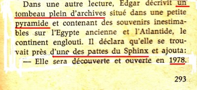 En fait, comme dans le texte de morpheus.fr, on parle également d'Edgar Cayce, transmettons aussi ici, la déclaration de ce dernier (vue plus haut en partie), extraite de sa lecture 5748-6 concernant la Grande Pyramide de Khéops : " Sa construction dura cent ans. Elle fut commencée et terminée sous le règne d'Araaraart, avec Hermes et Ra (C'est à dire Ra-Ta qui se fit appeler ainsi à la fin de sa vie) .