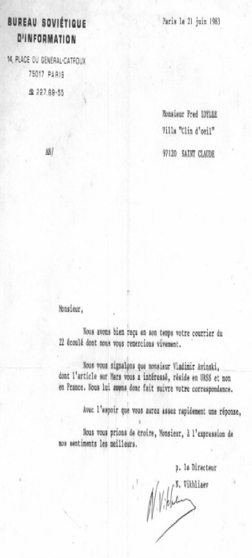 Le 22 Mai 1983, nous avons adressé à Mr Vladimir Avinsky, pensant qu'il était de nationalité française, une missive de deux pages que nous avons glissée dans une lettre envoyée à la revue "L'Autre Monde". Le 27 Juin 1983, nous avons été très étonné de recevoir une réponse du Bureau Soviétique d'Information de la Place Général-Castroux à Paris, nous spécifiant que notre lettre allait être transmise à Mr Vladimir Avinsky en URSS.(Voir photocopie ci-dessous).