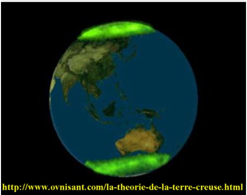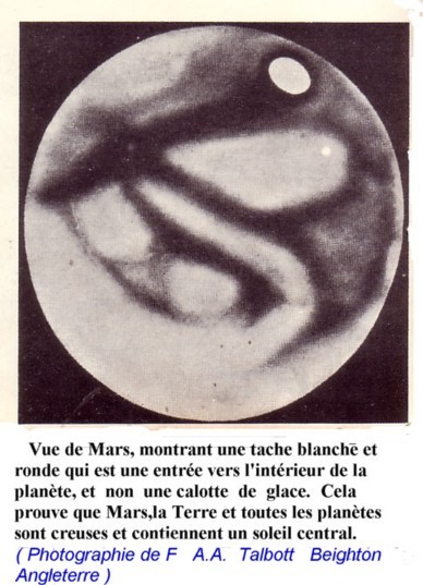 gens vivant à l'intérieur de cette terre. Ils ont atteint à un plus grand développement que nous, et il arrive que certains d'entre eux sortent de la terre dans des véhicules spéciaux".