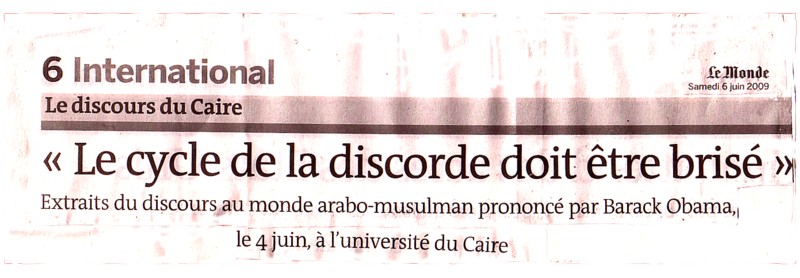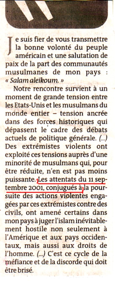 donc de bonnes découvertes surARTivision (qui bouge beaucoup ces temps-ci : voir mes nouveautés sur le côté gauche de la page de garde ), et je te dis à un de ces jours prochains si le Maître du Temps , n'y voit pas d'inconvénients. Vives amitiés tropicales. Fred Idylle. www.artivision.fr Fin de citation. VI Quand le Président Obama reçoit le Prix Nobel de la Paix (paragraphe en date du 13/10/09).Le 12/10/09, nous avons pu lire sur le site Le Monde.fr, cette portion d'entrefilet : Barack Obama, prix Nobel de la paix 2009... Un choix, un brin provocateur, qui a suscité l'étonnement à travers la planète. A peine arrivé aux affaires, le premier président de couleur américain se voit attribuer cette prestigieuse distinction "pour ses efforts à renforcer la diplomatie et la coopération entre les peuples ". Aussitôt, l'heureux récipiendaire a dit sa grande surprise et son immense gratitude... Lorsqu'il a été élu président des Etats-Unis, le monde entier a retenu son souffle et mis tous ses espoirs dans cet homme au destin exceptionnel. Jeune et talentueux, Barack Obama incarne le renouveau d'une Amérique minée par la crise et laminée par l'ère Bush, dont les deux guerres, l'une en Afghanistan, l'autre en Irak, hantent encore et toujours les esprits... ................... Fin de citation. Nous l'affirmons encore une fois ici, pour ARTivision, la seule façon d'établir un début de Paix sur cette planète, c'est d'avouer l'existence dans notre environnement d'êtres très évolués, qui nous considèrent vraiment comme des minus débiles toujours avides de pouvoirs (économiques, politiques et militaires etc.. ) dérisoires, et qui n'arrêtent pas de faire des coups pendables entre eux. ARTivision pense aussi que si nous étions moins vindicatifs et plus conciliants entre nous , ces êtres ( les Dieux mentionnés dans la plupart de nos mythologies), pourriaent nous venir en aide, en nous dévoilant comment utiliser des energies cosmiques gratuites, et nous faire ainsi entrer dans la Conférération des Peuples Unis de la Galaxie. Si certains croient que cela n'est qu'une vue de l'esprit basée sur du vent, qu'il prennent au moins l'initiative de lire ce qui suit que nous avons reçu dès le 27 Août 2009 : Les Extraterrestres existent réellement.L’astronaute et Dr Edgar Dean Mitchell, (6ème à marcher sur la Lune) l’annonce ouvertement.Nous sommes visités et un contact permanent existe avec certains gouvernements. Interview de l’astronaute et Dr Edgar Dean Mitchell, sur Kerrang-Radio : Interview de l’astronaute et Dr Edgar Dean Mitchell, sur FoxNews : : L'affaire Roswell (que nous avons évoquée dans au moins dans une quinzaine d'articles) était donc bien axée sur un crash réel, et les autorités américaines et autres, ont tout fait pour cacher au monde entier, l'un des plus grands événements de cette planète, qui en aurait assurément changé totalement la face dans bien des domaines. Nous ne pouvoir qu'applaudir en face du courage inoui qu'il a fallu à l’astronaute et Dr Edgar Mitchell, pour qu'il se décide à avouer la vérité sur l'affaire Roswell. Nous sommes donc désormais en bonne voie pour admettre que d'autres êtres plus puissants que nous, évoluent dans notre environnement ( Sur la Lune, Mars, Mercure..etc..) et cette Vérité va devoir s'imposer de plus en plus. Les gesticulations futiles de nos chefs d'états ne pourront en retarder l'éclosion que pour peu de temps encore, et nous espèrons vivement que le nouveau Prix Nobel de la Paix, comme l’astronaute et Dr Edgar Mitchell , en prendra vite conscience. Hélas pour ARTivision , cela n'a pas l'air d'être en bonne voie, car nous l'avons déjà écrit dans un autre article, il est pour nous impensable que Barack Obama, n'ait pas un jour visualisé le documernt suivant, avant son arrivée à la tête de l'Etat des USA : Or le 7 Juillet 2009, nous sommes tombés par hasard (Hum...hum), sur la page 6 du quotidien "Le Monde", en date du Samedi 6 juin 2009, qui donnait des extraits du discours fait le 4 Juin à L'Université du Caire, par le président des Etats-Unis, Barack Obama : ![]() Ce discours comportait dit-on, près de 6000 mots, mais, à notre avis, il y eu 8 mots de trop, que nous soulignons en rouge dans la traduction suivante : ![]() Ces huit mots enlevés, le discours n'aurait rien perdu de sa force, et deviendrait alors : " ...n'en est pas moins puissante... La poursuite des actions violentes engagées par ces extrémistes contre des civils, a amené certains dans mon pays...." Ainsi exit... cette affaire très douteuse du 11 Septembre 2001. Mais si le Président Barack Obama, dont le discours a été minutieusement préparé, a osé parler de ce 11 Sept 2001, c'est que son entourage est absolument en combine avec ces Forces Négatives de l'Ombre, qui nous manipulent, au plus Haut Niveau. Point Barre. En conséquence, il ne faut pas du tout attendre, que ce Président, (malgré la sympathie que le monde lui accorde, même après qu'il ait reçu le prix Nobel de la Paix, en question ), nous fasse des révélations sur quoi que ce soit, qui mettent en relief la faiblesse des USA, vis à vis des Forces Cosmiques (aussi appelées, nous l'avons dit plus haut, les Dieux), qui nous surveillent depuis des lustres. ( Donc pas de révélatiohns, même minimes, sur les ovnis, sur la Terre creuse , sur les constructions sur la Lune, sur Mars ou ailleurs, etc ...). A bon entendeur Salut... VII Quand le Webmaster d'ARTivision, écrit à divers sites pour avoir une simple image de la "Bible d'Obama" (paragraphe en date du 11/01/2010).N'ayant pas trouvé dans commerce, un exemplaire de la la Bible de 1853, sur laquelle Barack Obama a prêté serment le 20 Janvier 2009, nous sommes alors toujours à la recherche de la première page de la Genèse de cette Bible. C'est alors que sur Google, nous sommes tombés sur la page importante : Voici donc le début de cette page, au cas où e