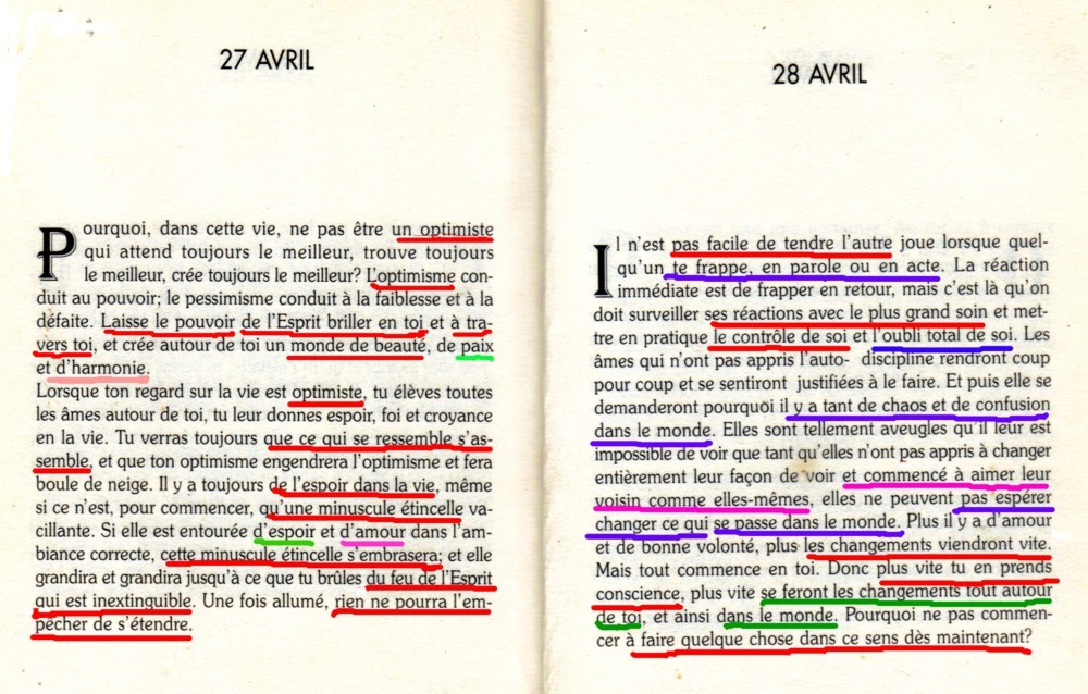 Mais cependant, il nous appartient aussi ce jour, (sans changer les formes et la taille de l'écriture), de présenter les méditations en date du 27 et 28 Avril, du Très Grand Maître de Findhorn, qui nous explicite clairement l'attitude à adopter pour établir sur cette planete une paix vraiment durable. :