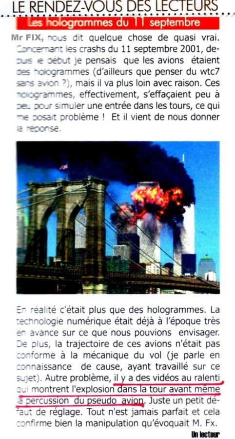 que l'exploit qui consistait à précipiter deux gros porteurs, sans aucun guidage électronique calibré, sur les tours en question, était un fait, tout à fait impossible. Et aux dernières nouvelles, on parle de supers hologrammes, et qu'il existerait justement, des images, où l'explosion a eu lieu, juste avant l'impect de l'avion sur la tour, et voyez donc ainsi, cet entrefilet en page 15 de la revue TopSecret n°98 d'Août-Sept 2018 :