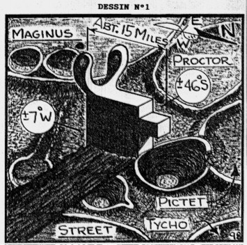 Il dépeint notamment un prodigieux ensemble, situé près du cratère Pictet, composé d’un parallélépipède rectangle surmonté d’immenses appendices en forme d’oreilles de chien et doté d’une excroissance cubique sur son côté droit. (voir dessin n°1):