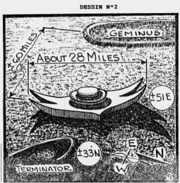 Son texte de juin 2000 est le premier que j’ai lu sur ses prétendues découvertes, mais il semble avoir passé d’autres articles avant mon premier abonnement à FATE, ainsi que dans d’autres magazines que je ne reçois pas. Il y précise qu’il a pu détailler avec précision de fantastiques « constructions » qui lui sont apparues comme devant être de monumentales « machines » ou encore d’immenses structures pouvant contenir des « usines » capables de se déplacer dans le même secteur.