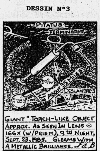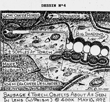 Après le plat de résistance, voici le dessert, peut-être même le record dans le gigantisme. Il s’agit d’un « engin » qui affecte la forme générale d’un chalumeau oxhydrique, qui a été observé pour la première fois en septembre 1985. M. Bach avait d’ailleurs publié un texte sur cette étrangeté lunaire, dans la revue The Gate de juillet 1987, accompagné d’un croquis Ce monstrueux artefact se trouve entre le cratère Pitatus, le cratère Deslandes, et la Mer des Nuées. (voir dessin n°3):