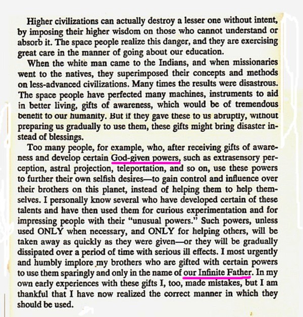 Mais comme justement Madame Monique Mathieu nous avait si bien parlé plus haut du spationaute non officiel George Adamski, voyons ici ce que ce denier, nous disait déjà en 1955 au sujet de cette affaire de division entre les humains. et tout cela est tiré de l'ouvrage qui suit et venant disait-on alors d'un prétendu affabulateur, super vendeur de hot-dogs du Mont Palomar...