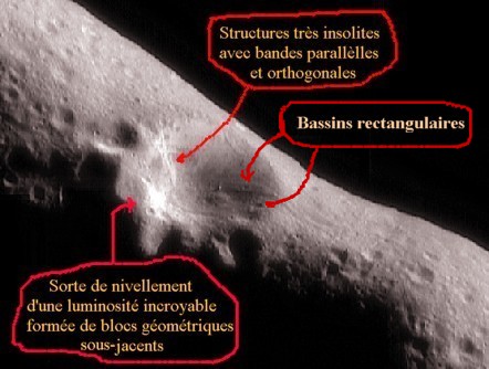 En effet si vous scrutez le bout de la flèche n°1, vous apercevrez une structure très insolite en forme T, qu'il faudrait surtout bien analyser, tant elle est surprenante, ainsi que d'autres structures qui se trouvent en bout de la flèche n° 2 un complexe très extraordinaire de structures où règnent un bassin étrange ayant des angles droits et jouxtant un ensemble de blocs insolites presque cachés hélas par l'ombre formée dans grand cratère.
