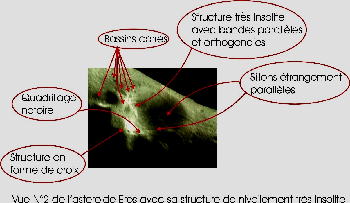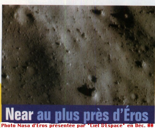 Dans son numéro n°379 de Décembre 2001 la revue "CIEL & espace" publie, dans le cadre d'un dossier intitulé "Astéroïde la grande traque" sous la plume de Jean-François Haït, quelques rares photos d'Eros plutôt banales, sans doute judicieusement choisies pour éviter toutes questions inopportunes sur lesquelles nous avons repérés cependant quelques détails insolites. Notons d'abord qu'en interrogeant Robert Farquhar directeur de la mission de Near-Shoemaker, ce dernier nous apprend que "La sonde Near a survolé Eros à 2,7 km d'altitude à peine . Cela nous a permis de prendre près de 160 000 photos à haute résolution de sa surface sans compter les données des spectrographes infrarouge, X et gamma qui nous renseigneront sur la composition de l'astéroïde" . Comme nous aimerions analyser quelques unes de ces photos qui n'ont pas fait l'objet de publication sur Internet?