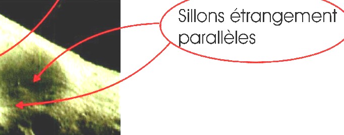 Enfin sur la partie gauche de la photo d'Eros présentée, on distingue les traces de cette poussière citée plus haut et ici elle prend des formes géométriques particulièrement curieuses où règnent les lignes orthogonales. (Voyez donc l'image n° 3 suivante:)