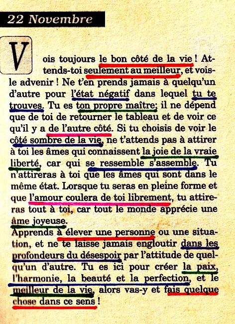 "....Prenez conscience de cela. Regardez parallèlement à ces actions destructives ce qu’ont réalisé des Êtres aux consciences éveillées en certaines régions de votre globe. Par exemple à Findhorn en Écosse dans ces jardins merveilleux créés par Hélène et Peter Caddy, ayant compris que la merveilleuse force de l’Amour, fait pousser abondamment des fleurs et des légumes. Cette communauté encore très active est un exemple vivant des possibilités créatrices de l’Esprit relié à cette merveilleuse force d’Amour.... "