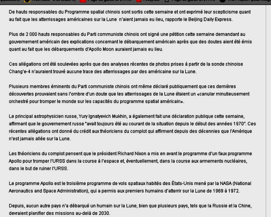Il est en effet bon de redire ici que beaucoup de journalistes, éditorialistes, et autres consorts chroniqueurs zélés, ont lamentablement loupé le coche de cette affaire lunaire, en ignorant de plus, le fait, qu'en plein système moderne, analysé par toutes sortes de médias prétendus évéillés, on nous a parfaitement et sournoisement mystifiés, dans de nombreux cas, comme par exemple, l'affaire très scabreuse du débarquement bidon des américains sur la Lune, (dont on vient justement, de présenter ci-dessus, certaines prémices), ou encore l'affaire du Crash de Missouri en Mai 1941, l'affaire de Pearl Harbor en Déc. 1941, l'affaire du crash de de Roswell en Juillet 1947, l'affaire de l'assassinat du Président Kennedy en Nov. 1963, l'affaire de la destruction des tours jumelles de New-York en Sept. 2001, l' incroyable affaire Barboto révélée aussi en 2001 etc..., et bien d'autres affaires, encore cachées...
