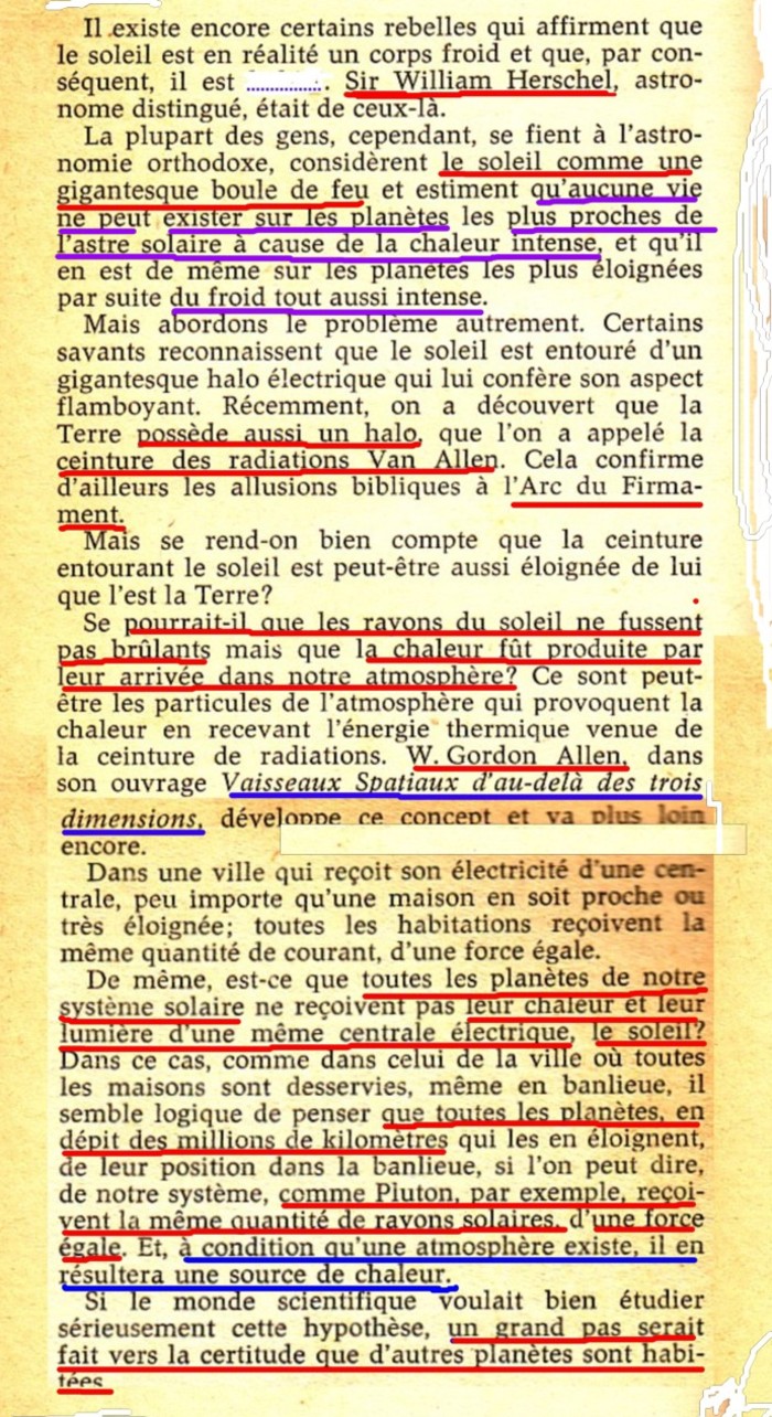 Mais pour le moment, notre propos est de découvrir l'origine des véritables soucoupes interplanétaires. Les planètes voisines semblent apporter la réponse la plus plausible: Mars et Vénus. Mais alors, pourquoi pas aussi Saturne, Jupiter, Uranus, Neptune, Pluton et toutes les planètes encore inconnues? On nous oppose que la chose est impossible car toutes les planètes au-delà de l'orbite de Mars sont trop glacées pour que la vie puisse y exister, et que Vénus et Mercure sont trop brûlantes, mais rien ne nous affirme que la chaleur en tant que telle émane du soleil. Les textes anciens nous apprennent que le Soleil produit une énergie irradiante mais pas de chaleur (telle que nous la connaissons) que cette chaleur n'est qu'un sous-produit de l'énergie soumise à la friction de notre atmosphère.