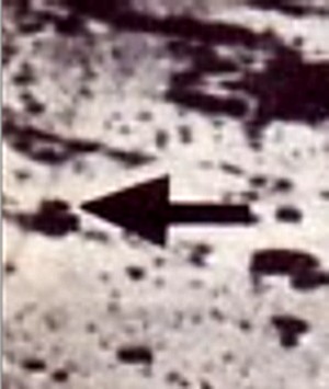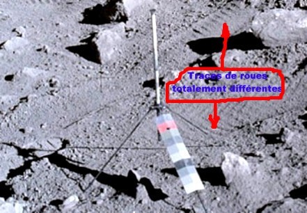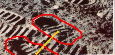 On y voit clairement un engin excavateur qui triture le sol lunaire ( (Voir la structure très insolite au centre du cercle) , sur un contrefort du cratète Copernic , déjà bien raboté, n'est-ce pas, sur sa droite .