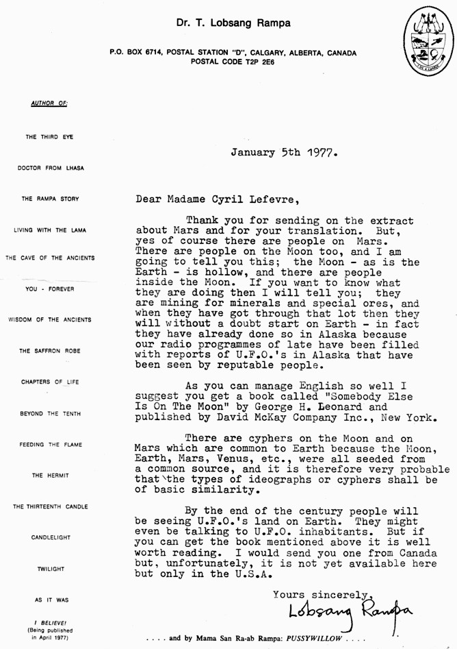 Dans l'ouvrage précédent "C'était ainsi", le lama Mingyar Dunduf (ou Dundup) explique à Lobsang, que lors d'une plongée dans les annales akashiques, il a vu, à une époque où le Tibet était au bord de la mer, "d'étranges choses dans le ciel" et aussi "des êtres à la tête en forme de cône" qui vivaient comme nous sur cette terre.