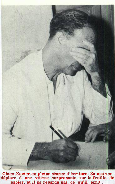 du Brésil, qui ne se laissait pas facilement débousolé. Mais le plus surprenant est encore à venir. g) Juridiquement Vôtre. Mais pour finir voyons encore quelques lignes du livre P. Mc Gregor: "En 1935, O Globo, le quotidien qui va devenir le journal du soir le plus lu du Brésil et dont le noyau de lecteurs se compose de catholiques, publie une série d'articles sur Xavier. Au cours d'une réunion patronnée par cette publication et à laquelle assistent des reporters ainsi que plusieurs centaines de spectateurs, le médium "relaye" un message en anglais, langue qu'il ne connaît pas, écrit à l'envers et de droite à gauche, lisible seulement à l'aide d'un miroir! Ce sont là simples prélimmaires. 1937 sera l'année décisive. Xavier décide alors de confier à la Fédération spirite brésilienne, toujours de façon désintéressée, la publication d'une série de messages qu'il a reçus de Humberto de Campos, le critique (l'académicien) qui le premier a attiré l'attention sur lui et qui est mort peu d'ans auparavant. S'y ajouteront d'autres communications de la même source, assez pour fournir la matière d'un livre que la Fédération va publier comme étant de Campos et retransmis par Xavier. La controverse de se déchaîner. La stupeur ne serait pas moins grande si quelque béotien du Middle West venait de composer un roman signé Hemingway absolument conforme quant à l'expression. Rédacteurs de presse, critiques, homme de la rue tout le monde prend part au débat. De Campos est-il l'auteur ou non? Si supercherie il y a, reste à expliquer comment un médium quasi illettré a pu contrefaire l'écriture d'un des plus grands stylistes. La controverse fait toujours rage lorsque, un an plus tard, paraît un nouvel "ouvrage" d'Humberto de Campos "posthume" lui aussi. Les journaux titrent à la une de nouveau. La république des lettres délègue cependant un de ses censeurs les plus redoutés en la personne de Grieco dont la réputation n'est plus à faire. Il arrive que ce critique éminent passe par Belo Horizonte un beau jour. Les spirites, toujours disposés à recueillir l'avis d'un expert sur leur médium vedette découvrent son adresse et l'invitent à assister à une séance de travail de Xavier. La scène se passe en 1939. (Année, on le sait, bien chère au webmaster) Passons sur les détails et arrivons vite à l'incroyable: Et voilà ce que dit ce critique littéraire. «On m'avait installé à la table d'honneur, avec les officiels. Là, je me trouvais être le voisin de Chico Xavier. Comme je le remarquais rapidement, ce dernier ne donnait pas l'impression d'une intelligence supérieure. C'était un mulâtre de taille moyenne, plutôt maigre. Les cheveux étaient crépus et on notait une petite tache blanche à un oeil... Celui qui présidait la réunion me pria d'apposer mes initiales sur vingt feuilles de papier dont le médium allait se servir, ceci afin d'éviter toute substitution. Je m'exécutais... Mais, avec une vitesse vertigineuse, faisant courir son crayon plus rapidement que l'homme le plus habile à écrire à toute allure, Chico Xavier se mit à noircir les feuillets. L'écriture était tout à fait lisible et je déchiffrais au fur et à mesure les phrases qu'il alignait ainsi. «Tout d'abord, un sonnet attribué à dos Anjos. Ensuite j'eus la surprise de reconnaître le style de Campos et sa manière bien à lui de jouer avec les idées. La similitude était frappante. On peut arguer, bien sûr, qu'il s'agissait simplement d'un autre "à la manière de" comme en ont écrit notamment Paul Reboux et Charles Muller genre d'ailleurs tout à fait respectable. A mes yeux cependant, en tant que critique littéraire habitué à démonter la mécanique des styles depuis une trentaine d'années, ceci me produisit instantanément l'effet de tomber sur un inédit authentique. Tout Campos était dans ces lignes, son caractère aimable, son désir de rendre un son austère, le ton légèrement pontifiant dont il usait. Ces allusions à la Grèce antique, à l'Egypte, à l'Acropole, au voile d'Isis, c'était lui. Cette référence à Sainte-Beuve, l'un de nos critiques favoris, maître du goût et de la clarté que nous ne nous lassions pas d'exalter, lui et moi, c'était encore Campos. La construction de cet article était remarquable. Le lisant, aucune personne de culture moyenne n'aurait hésité à s'exclamer "Voilà qui est bien d'Humberto!" "Naturellement j 'étais sidéré... De nombreux jours se sont écoulés depuis cet épisode et je ne suis pas encore arrivé à une conclusion satisfaisante. S'agit-il d'un phénomène nerveux, d'une intervention extra-terrestre? Les éléments de la réponse me manquent, faute de connaissances spéciales en la matière. En outre, j'ai reçu une éducation catholique. J'admire les génies et les héros qui ont donné tant de prestige à une religion qui a pu produire un saint Antoine ou un Bossuet. A quel point je révère l'éthique et l'esthétique de l'Église, j'en ai témoigné dans mon Saint Fraitçois d'Assise et la poésie chrétienne. Cependant, je le répète en toute honnêteté, ce message signé Humberto de Campos m'a fait l'impression la plus vive...» Mais P. McGregor nous explique encore: " Ainsi parle le doyen reconnu des critiques littéraires du Brésil. Il apparaît manifestement en peine de concilier sa qualité de catholique avec le phénomène qu'il vient d'observer et dont l'authenticité lui semble indiscutable, phénomène rangé par l'Église parmi les "artifices du Malin" . La plus grande chaîne de journaux du pays, rassemblant quelque vingt quotidiens, achète le compte rendu de Grieco pour le publier simultanément. Du même coup, l'intérêt du public pour le cas de l'écrivain "disparu" ne cesse de croître. En 1940 un autre ouvrage intitulé "Nouveaux Messages" paraît, suivi l'année d'après par la "Bonne Nouvelle". Ce dernier traite des enseignements de Jésus. Toujours signé du