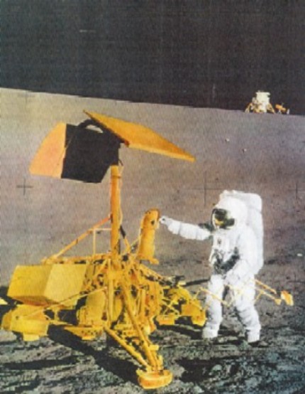 Dans ce même n°367 de Déc. 2000 cette revue nous présente aussi une image que nous avons vainement recherchée dans nos dossiers et que nous venons de retrouver grâce à l'ingéniosité et l'efficacité très active notre ami Roch Saüquere qui concerne les retrouvailles entre l'homme et la machine sur l'Océan des Tempêtes sur la Lune. En effet les astronautes Charles Conrad et Alan Bean, d'Apollo 12, auraient retrouvé le 19 Nov. 1969, la sonde Surveyor 3 qui s'était posée en douceur sur la Lune en 1967. Un des buts de la mission étaient précisément de visiter ce qui restait de cette sonde-robot et d'y prélever certaines parties métalliques et en particulier la caméra. Il s'agissait de vérifier l'état de conservation de ce matériel, après deux ans et demi d'exposition aux micrométéorites, aux radiations cosmiques, au vent solaire et aux poussées thermiques allant de -180 ° à + 120°.