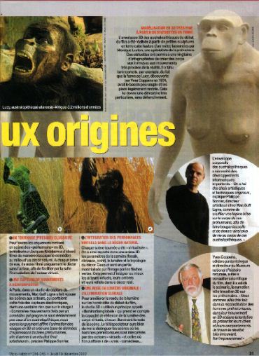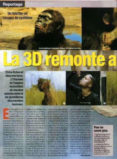 La revue en question ci-dessus, nous promettait donc ( La revue Science&Vie n° 1023 de Dec. 2002 pages 168 à 175, nous présente le même thème sous le titre: La préhistoire comme si vous y étiez.) la sortie prochaine d'un film diffusé par FR3, (Que nous avons eu le loisir de découvrir le 8 janvier à 20 heures sur la Chaîne RFO Tempo) concernant l'Odyssée de l'espèce retraçant la période de huit millions d'années qui s'étend de la naissance du premier primate à celle de notre plus proche cousin vieux de 30 000 ans l'homme de Neandertal.