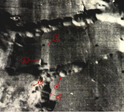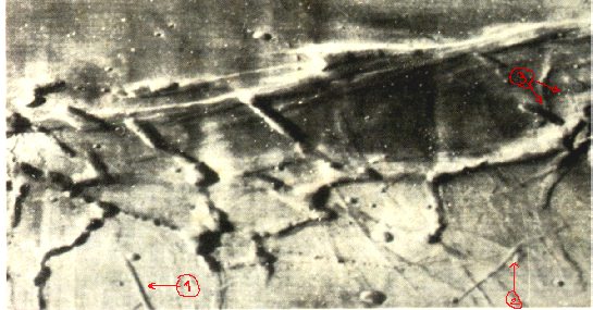 Quelle est, par exemple, la nature de cette structure rectiligne au bout de la flèche 1, qui démarre comme par hasard de la gauche d'un joli dôme qui accompagne les nombreux autres dômes qui trônent sur cette image ? Même question plus génante encore en bout de la flèche n°2 où, apparaît un chevauchement très insolite de deux structures, qui ne peuvent là, en aucune manière selon nous, être assimilées à des failles tectoniques, comme le prétend la légende ci-dessus. Voyez enfin en boutt de flèche n° 3, d'autres structures tout aussi surprenantes...