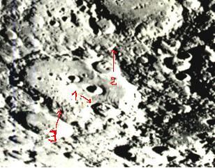 Comme le hasard, fait encore bien les choses n'est ce pas? Parmi les milliers de cratères de la Lune, c'est justement dans celui choisi par Stanley Kubrik et A.C. Clarke, que l'on aperçoit, au bout de la flèche 1, une sorte tour très structurée, vue prise, nous le précisons, par le télescope de 2,50 m du Mont Wilson, (donc moins sujette à caution que certaines photos de la NASA ):