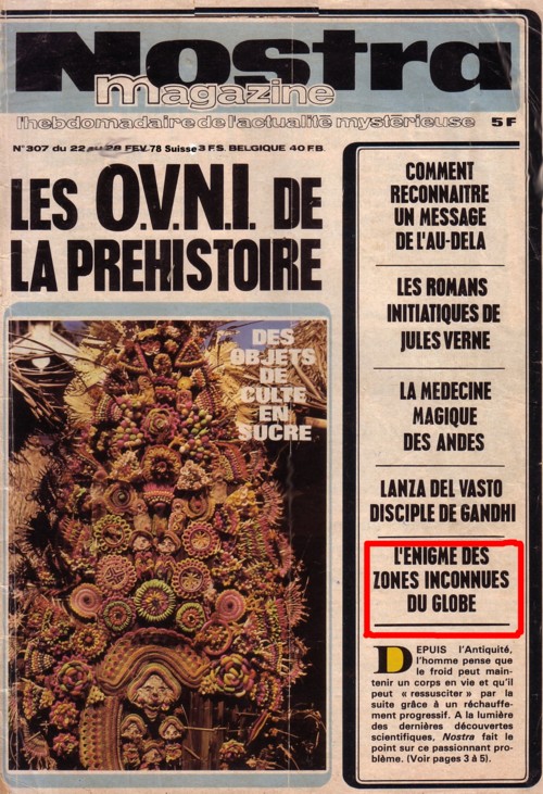 En effet, il n'y a pas bien longtemps nous avons retrouvé un document de la revue NOSTRA n°307 du 22-28 Fév. 1978 signé de Mr Jean-Luc BERAULT et intitulé "L'énigme des Zones inconnues du Globe".